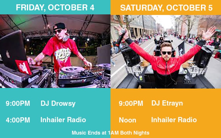 Inhailer Radio kicks of Friday, October 4 at 4pm with a live broadcast. DJ Drowsy takes it up a notch at 9pm and keeps the music going until 1am. Inhailer will be back the next day at noon to broadcast live from Roebling Point. DJ ETrayn takes over at 9pm on Saturday and will have you dancing until 1am.